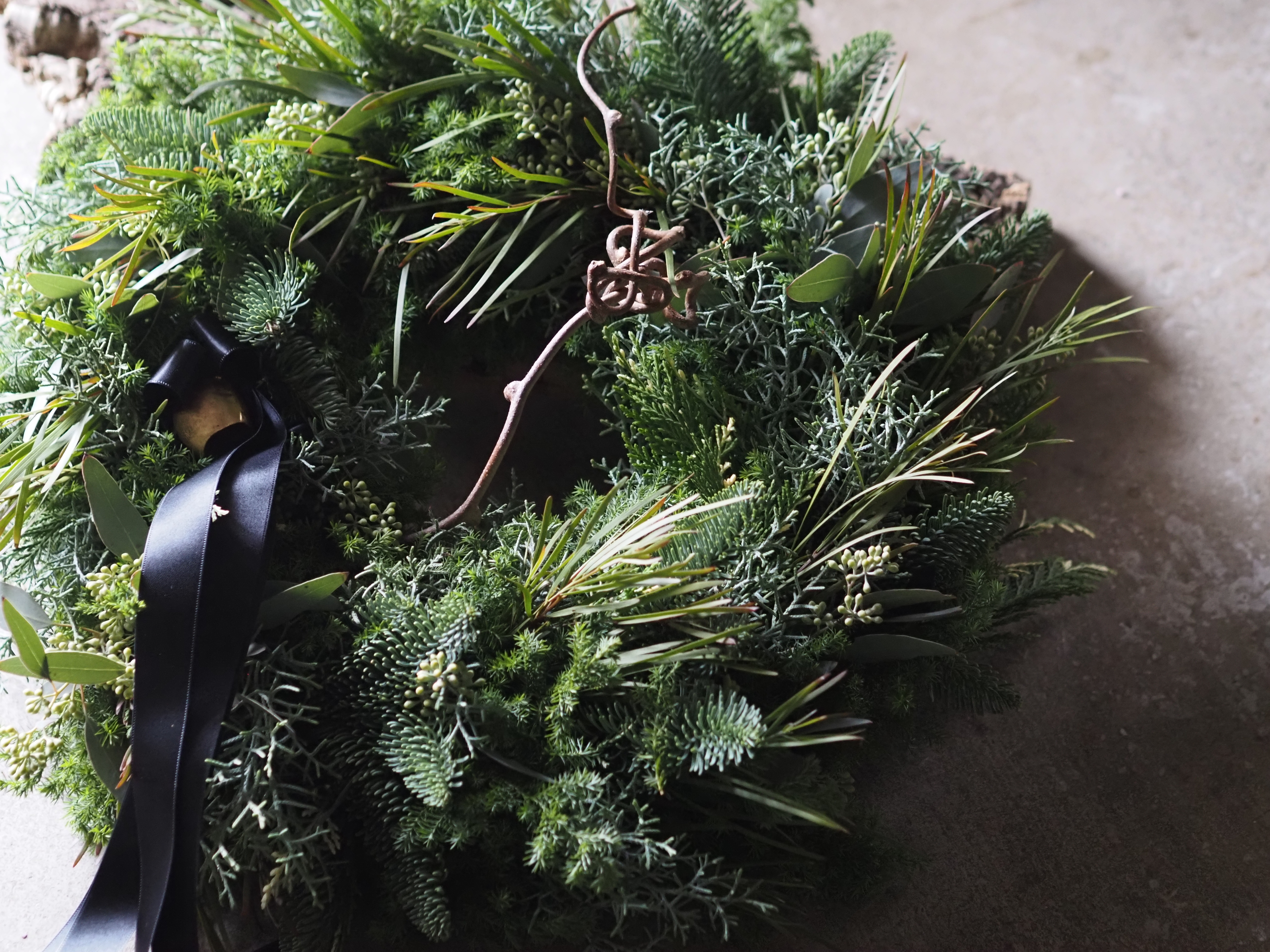 薩摩杉やヒバなどのフレッシュな針葉樹を贅沢に使って仕上げたクリスマスリースです。