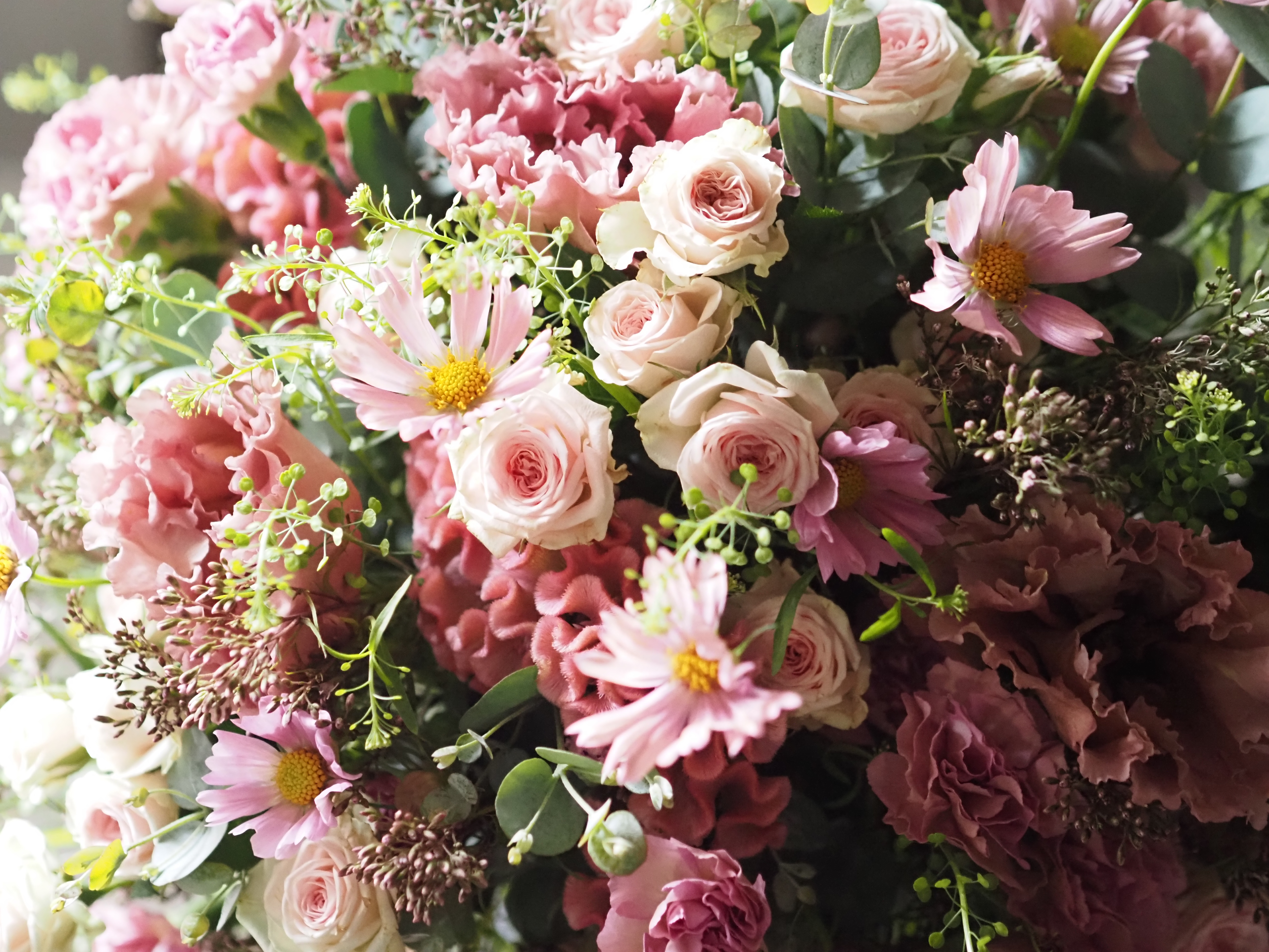 トルコキキョウ、スプレーバラ、コスモス、ケイトウ、スプレーカーネーション、羽衣、タラスピ、ユーカリ