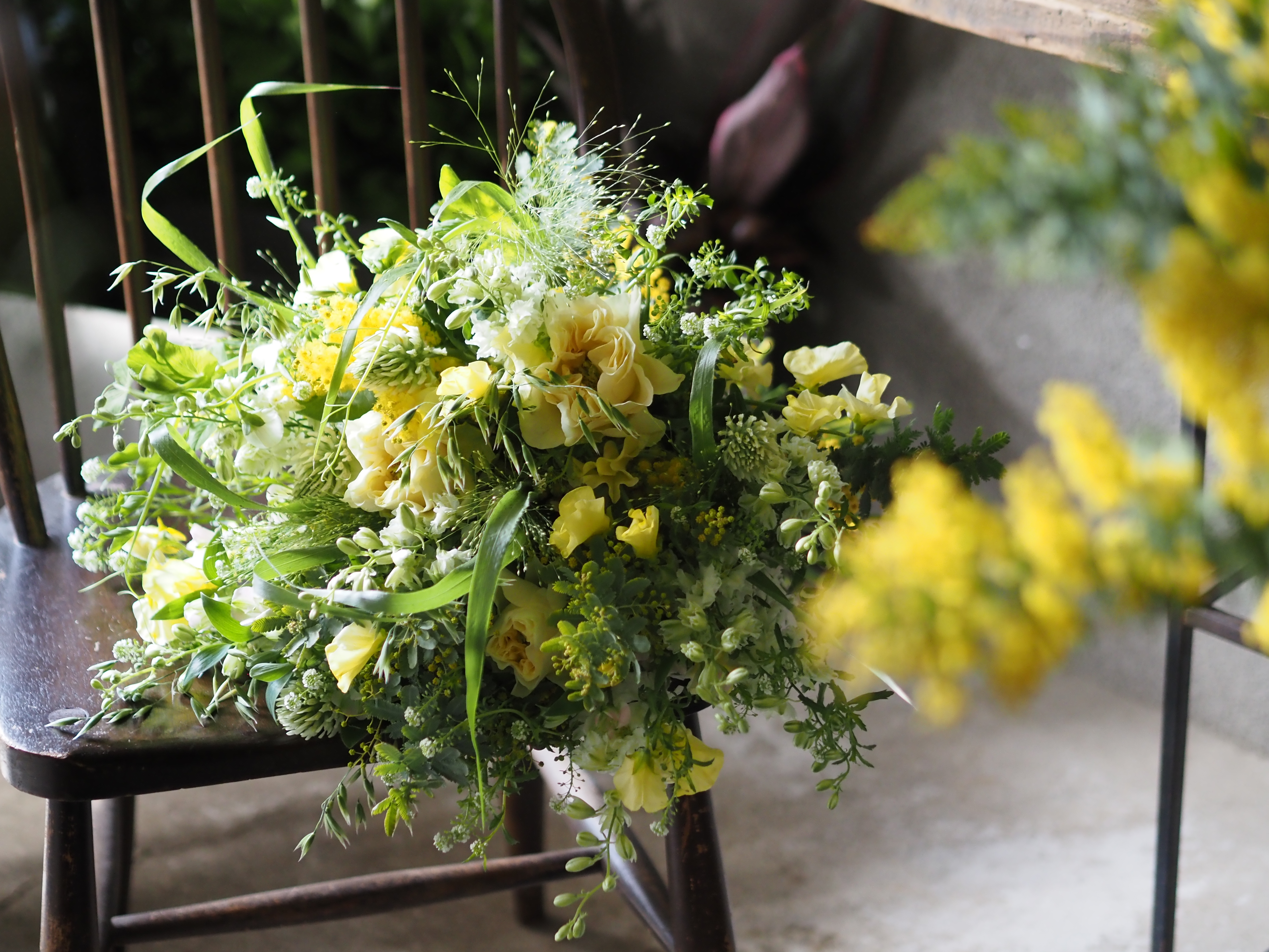 ミモザ、ラークスパー、スイートピー、バラ、アルストロメリア、クリスタルキャンドル、エンドウ豆の葉、スモークグラス、タラスピ、京乃鈴