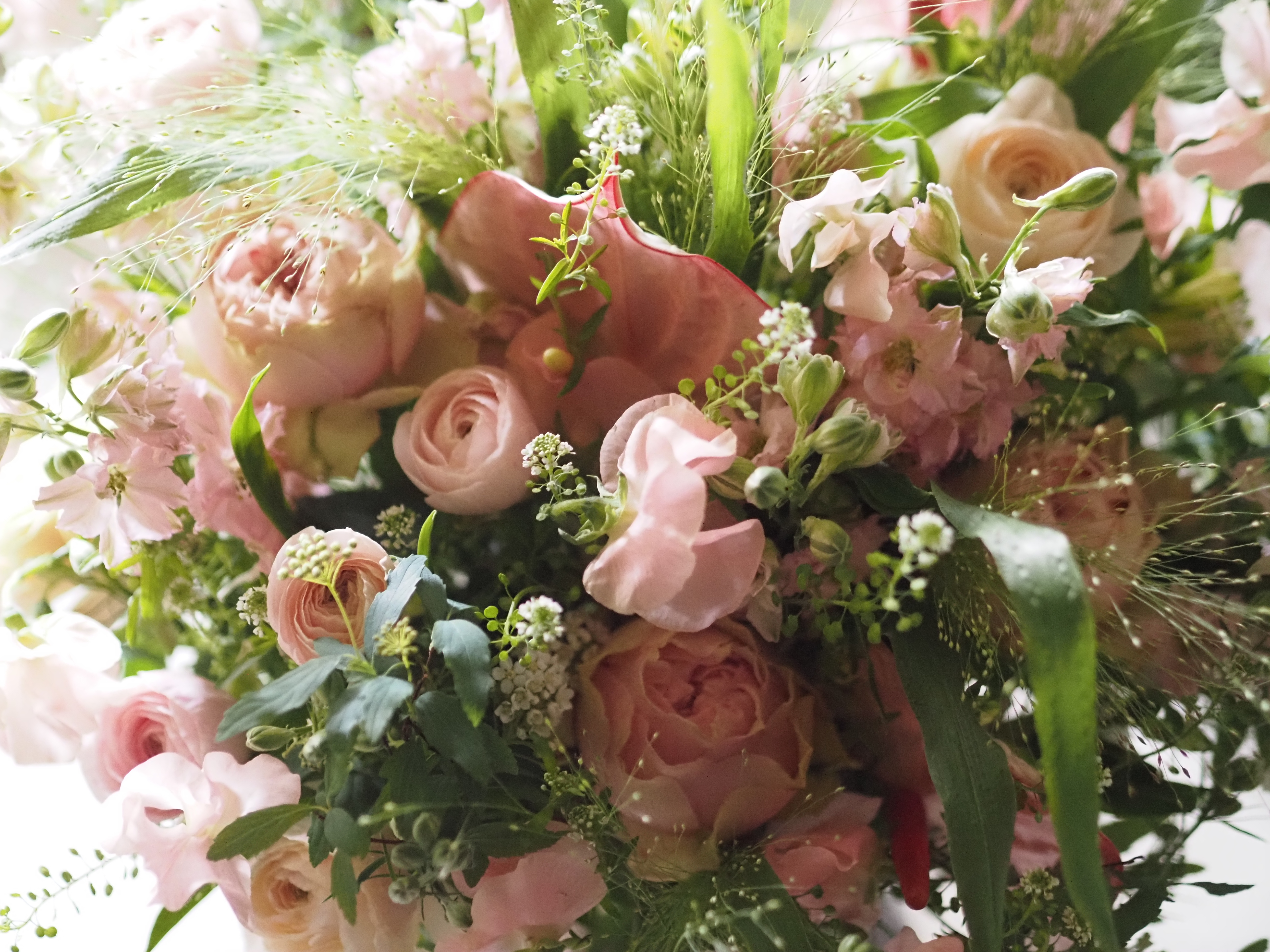 ラナンキュラス、スイートピー、バラ、アンスリューム、ラークスパー、コデマリ、スモークグラス、タラスピ