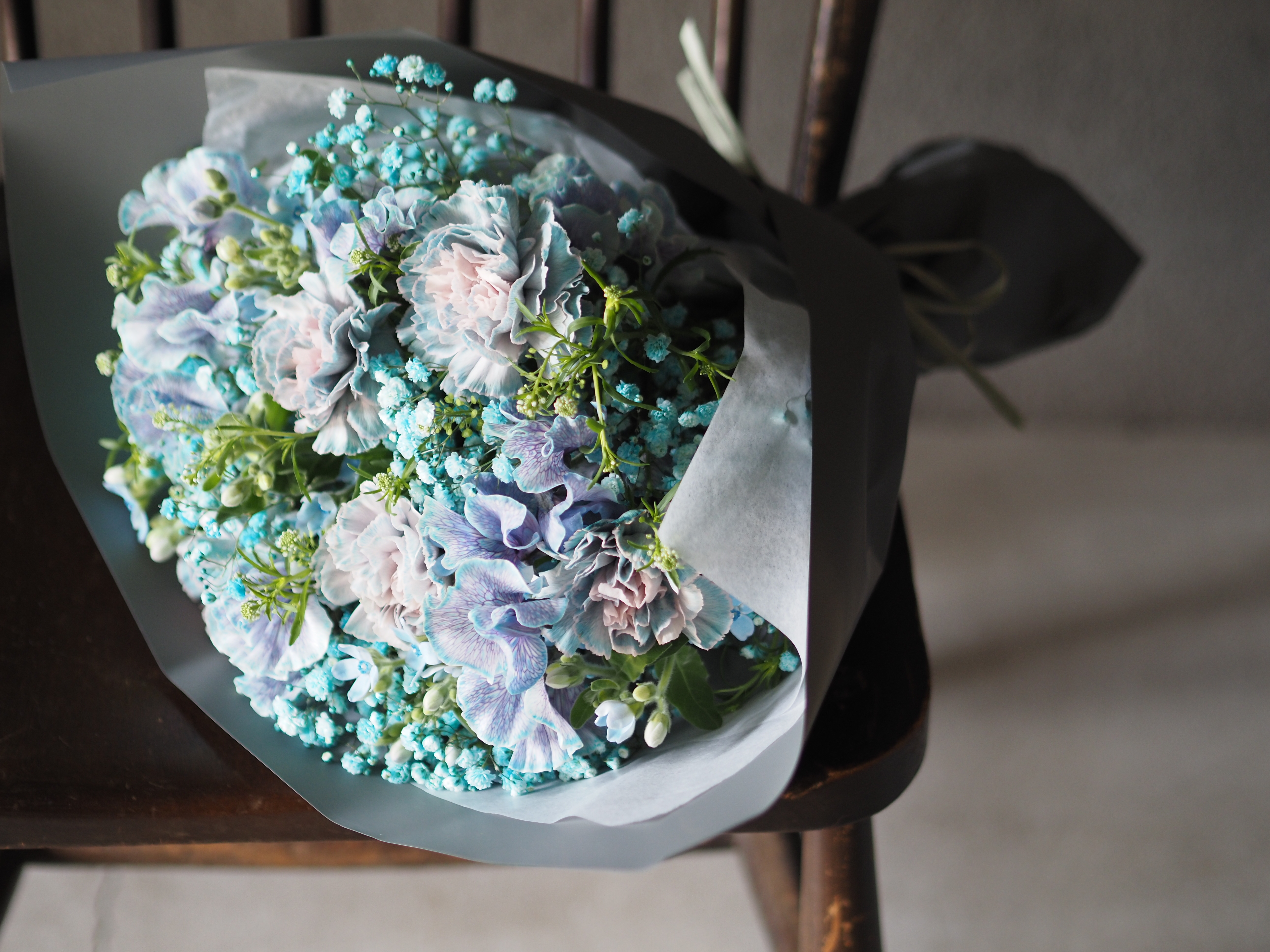 お誕生日ギフトに癒し効果の高い水色系の配色で束ねたブーケはいかがでしょうか。